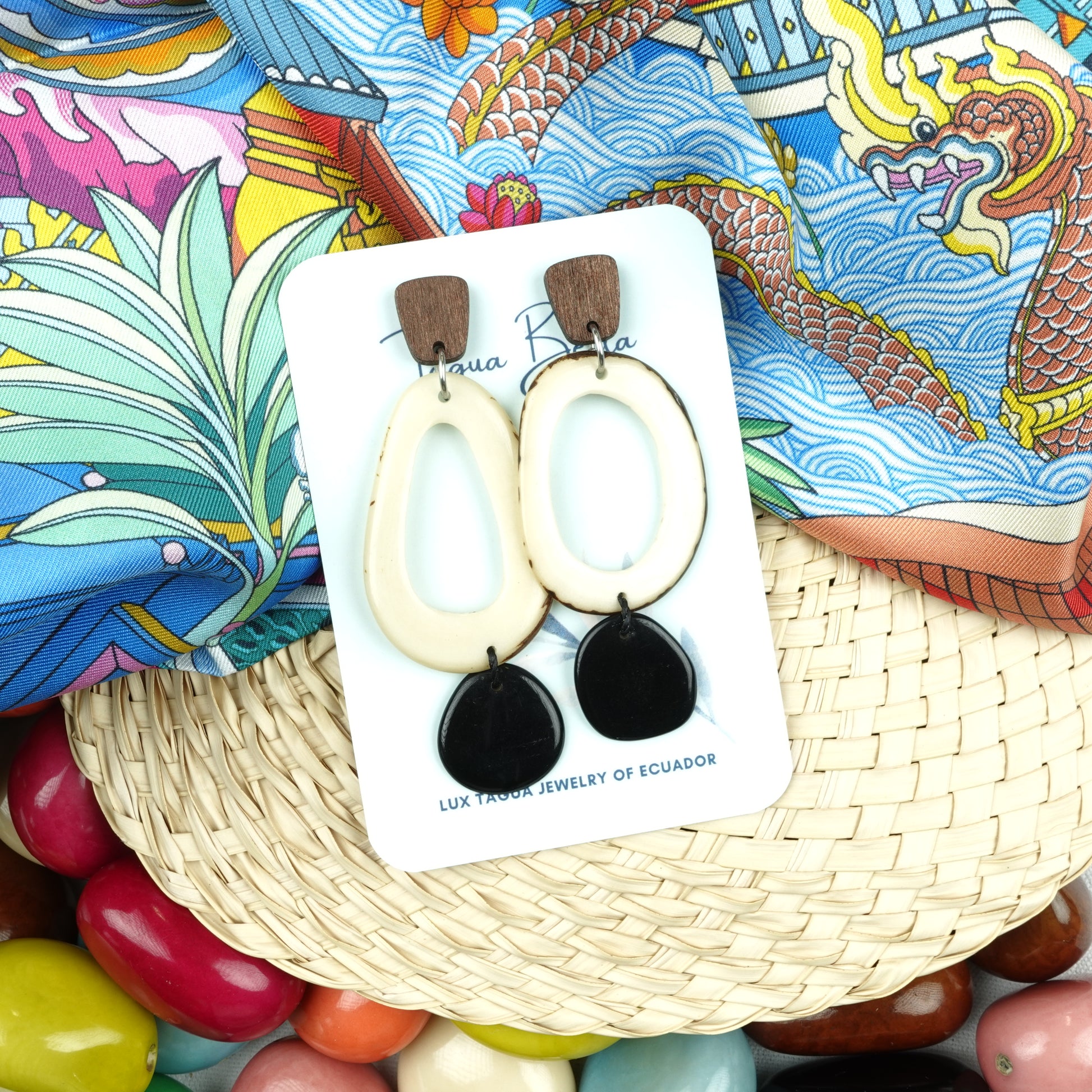 ABBY TAGUA EARRINGS. Abby offers an open slice of tagua with 1 small tagua slice below in a beautiful chandelier style. Abby earrings are finished with stainless steel hooks for comfort and easy care.