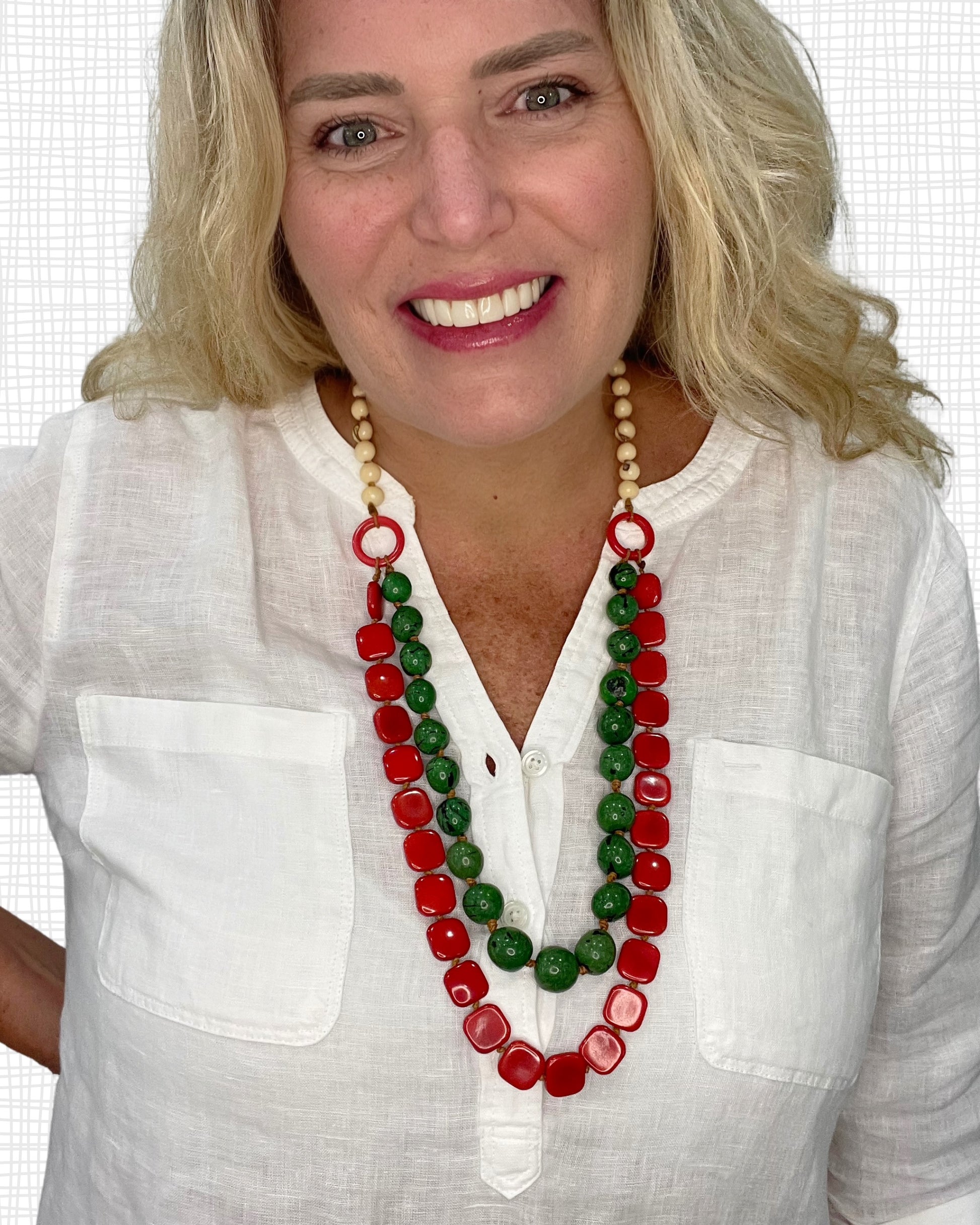 JANAย TAGUA NECKLACE. Best selling JANAย is a must have for every tagua lover. Our long beaded necklace goes on with ease,ย just slip herย over your head and go. Her square tagua pieces add a highly artistic look, complimented by two sizes of acai berry nut. Your favoriteย mix of colorsย adds a splash of personality to your style.ย
